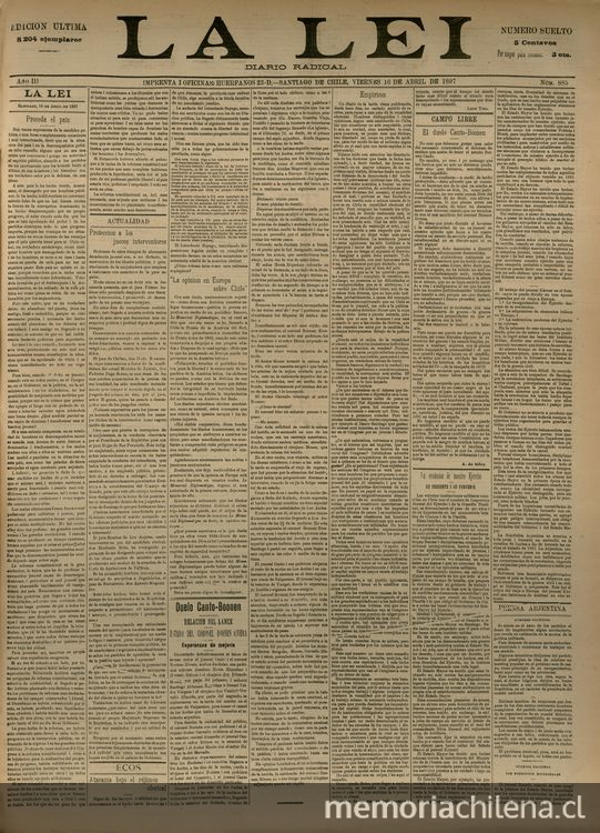La Ley / órgano del Partido Radical Santiago : [Editor no identificado], 1894-1910. 32 volúmenes, año III, número 885, (16 abril 1897)