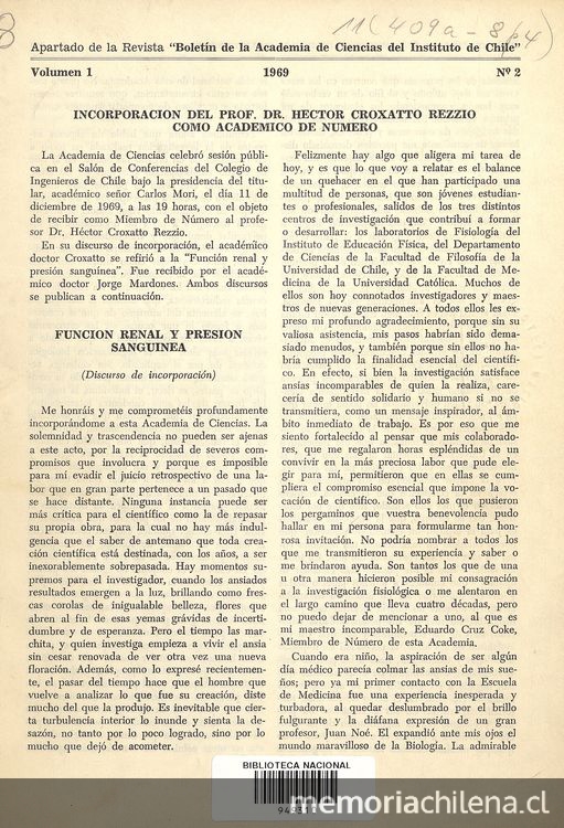 Apartado de la Revista "Boletin de la Academia de Ciencias del Instituto de Chile", tomo 1, número 2, 1969