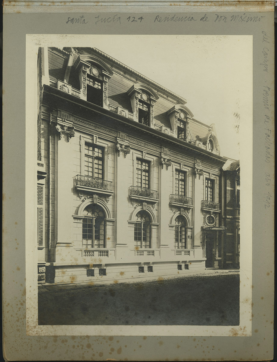 Fachada de la residencia Máximo del Campo Yávar, Santa Lucía 124, diseñada por el arquitecto Ricardo Larraín Bravo, hacia 1910