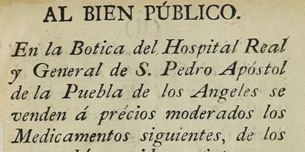 Al bien público. En la Botica del Hospital Real y General de S. Pedro Apostol de la Puebla de los Angeles se venden a precios moderados los medicamentos siguientes, de los que se da una idea sucinta, aunque suficiente de su uso y virtudes