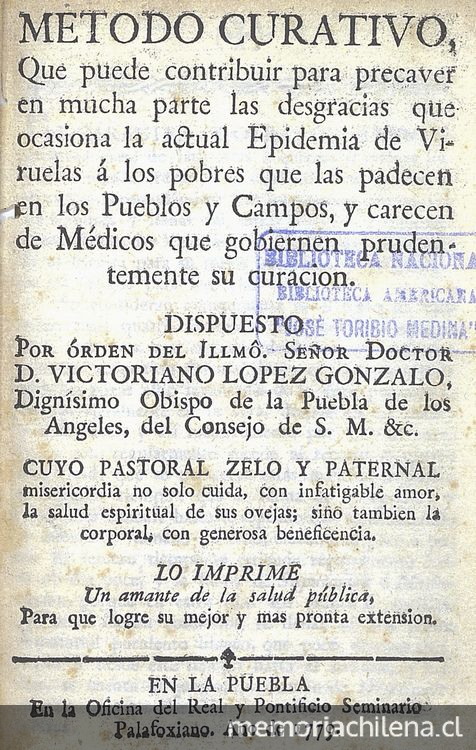 Método curativo que puede contribuir para precaver en mucha parte las desgracias que ocasiona la actual epidemia de viruelas a los pobres que las padecen en los pueblos y campos, y carecen de médicos que gobiernen prudentemente su curación