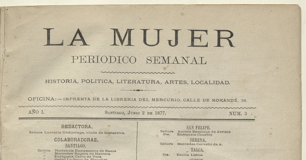 La Mujer. Santiago: redactado por Lucrecia Undurraga, viuda de Somarriva, 1877 (Santiago: Imprenta de la Librería del Mercurio), 1 volumen, año 1, número 3, (2 de junio de 1877), páginas 17-18