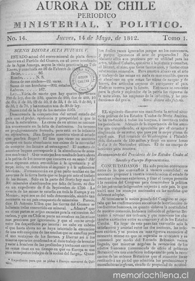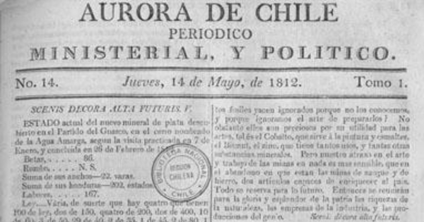 Aurora de Chile : periódico ministerial, y político. Santiago de Chile : Impr. de este Superior Gobierno, por los señores Samuel B. Johnston, Guillermo H. Burbidge y Simon Garrison, 1812-1813. 2 v. Tomo I, nº 14 (14 mayo 1812)