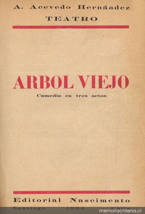 Arbol viejo : comedia en tres actos / Antonio Acevedo Hernández. Santiago : Nascimento, 1934. 63 p.