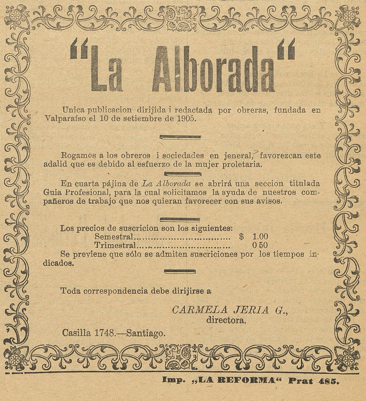 "La Alborada" : única publicacion dirijida i redactada por obreras, fundada en Valparaíso el 10 de setiembre de 1905