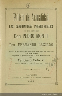 Las candidaturas presidenciales de los señores Don Pedro Montt y Don Fernando Lazcano : obras y virtudes de los políticos que las apoyan y lo que puede esperar el país de uno y otro ciudadano. Valparaíso :Imp. y Lito G. Weidmann,1906. 16 p. ;21 cm.