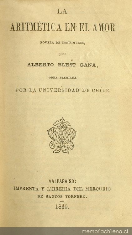La aritmética en el amor : novela de costumbres / por Alberto Blest Gana. Valparaíso : Impr. y Libr. del Mercurio de Santos Tornero, 1860. 576 p.