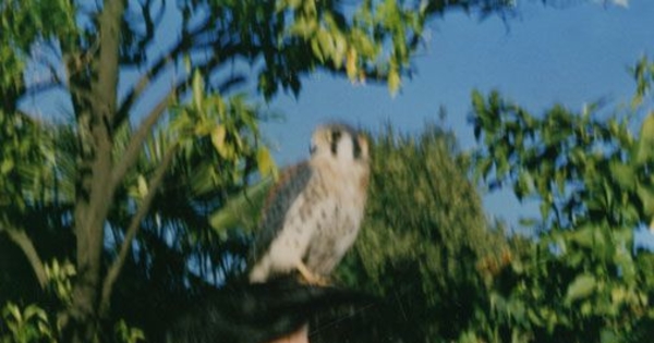 Fidel Sepúlveda con un cernícalo sobre la cabeza, en casa de Ema Jauch, Linares, hacia 1980