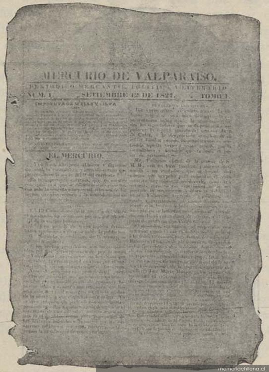 La primera página del primer número de El Mercurio aparecido el 12 septiembre de 1827