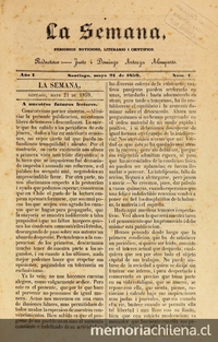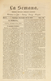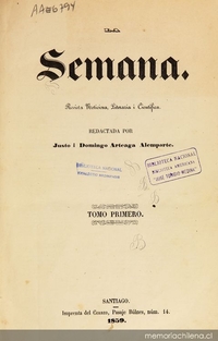La semana : revista noticiosa literaría i científica. Santiago :Impr. del Correo,1859-1860. 2 v. (49 nos.) ;30 cm.
