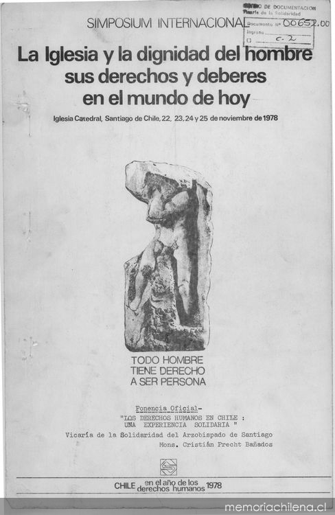 Organizado por el Arzobispo de Santiago, Vicaria de la Solidaridad Documento también forma parte de la colección del Archivo de la Vicaría de la Solidaridad Ponencia Oficial: "Los derechos humanos en Chile: Una experiendia Solidaria" Iglesia Catedral, Santiago de Chile, 22-25 de noviembre de 1978