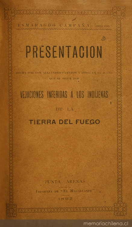 Presentación hechas por D. Alejandro Cameron y otros en el juicio que se sigue por: vejaciones inferidas a los indígenas de la Tierra del Fuego