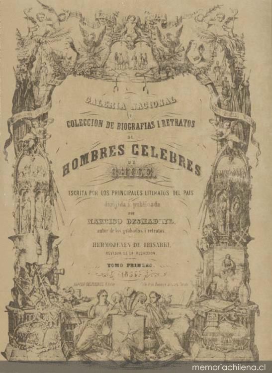 Galería nacional o colección de biografías i retratos de hombres celebres de Chile / escrita por los principales literatos del país ; dirigida y publicada por Narciso Desmadryl autor de los grabados i retratos ; Hermógenes de Irisarri, revisor de la redacción. [Santiago de Chile] : Imprenta Chilena, 1854. 2 volúmenes, 57 hojas de láminas sin numerar