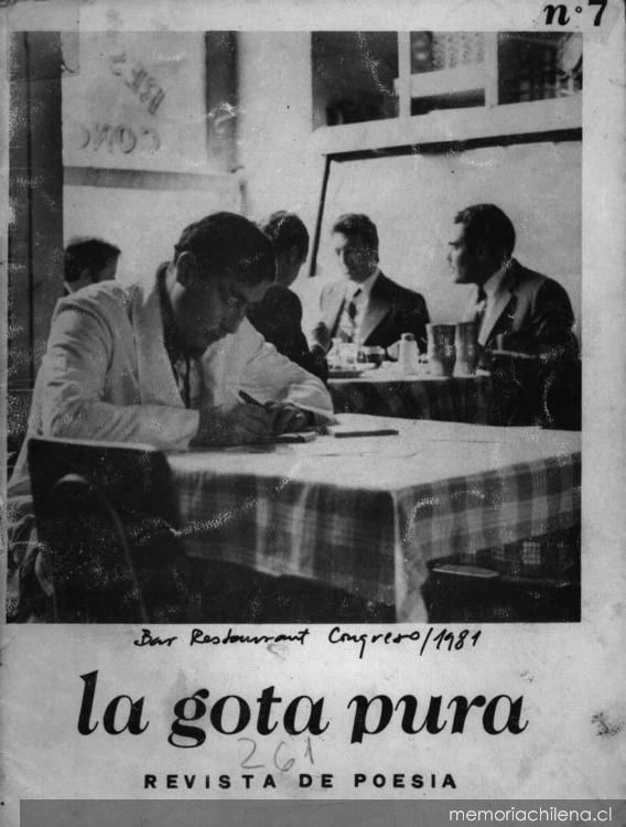 La gota pura : revista de poesía. Santiago : [s.n.], 1981- (Santiago : [Fepar]) 4 v., año 2, n° 7, (mayo 1983)