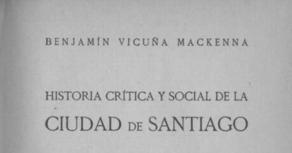 Historia crítica y social de la ciudad de Santiago : desde su fundación hasta nuestros días (1541-1868) / por B. Vicuña Mackenna. Valparaiso : Impr. del Mercurio, 1869. 2 v.