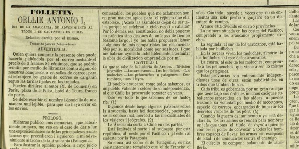 Orllie Antonio I, rey de la Araucanía: su advenimiento al trono i su cautiverio en Chile, relación escrita por él mismo