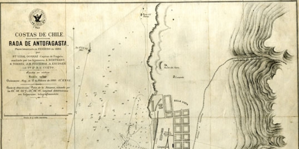 Plano levantado por Fco. Vidal Gormáz Capitán de Fragata, auxiliado por A. Bertrand ...[et al.] ; Delineador Carlos M. Prieto Escala 1:10.000 Publicado de orden del Sr. Ministro de Marina Lit. P. Cadot Levantado en Febrero de 1880 Incluye perfiles, declinación magnética, leyenda y plano de la ciudad de Antofagasta