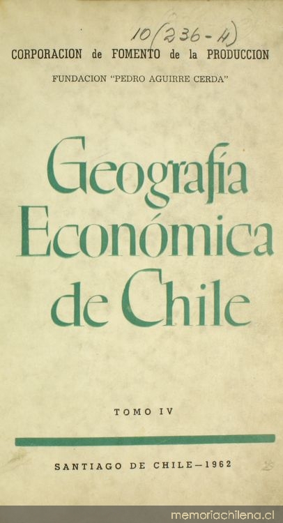 Geografía económica de Chile / Corporación de Fomento de la Producción ; Fundación Pedro Aguirre Cerda. Santiago : CORFO, 1950-1962 (Santiago : Universitaria) 4 v., [4] h. plegs.