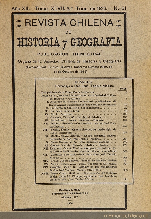 Revista chilena de historia y geografía / Sociedad Chilena de Historia y Geografía. Santiago : La Sociedad, 1911- . v., año 13, tomo 47, n° 51, (1923)