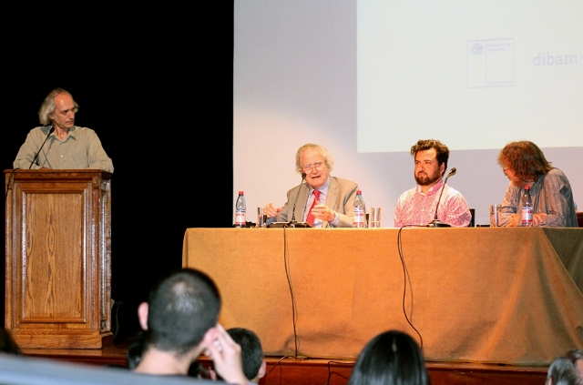 Los participantes del panel "Digitalizar es democratizar: 10 años de Memoria Chilena": Ezio Mosciatti, Roberto Torretti, Oscar Contardo y José Miguel Piquer.