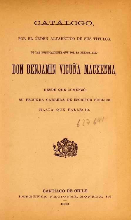 Catálogo, por el orden alfabético de sus títulos, de las publicaciones que por la prensa hizo Don Benjamín Vicuña Mackenna desde que comenzó su fecunda cerrera de escritor público hasta que falleció