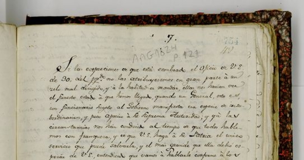 Palabras iniciales: Si las expresiones de que está sembrado el Oficio de V.E. de 30 del ppdo. no las atribuyesemos en gran parte a un zelo mal dirigido y a la habitud de mandar ... Documentos que tratan sobre la destitucion de José Miguel Carrera como General en jefe del Ejército Restaurador y el nombramiento de D. Bernando O'Higgins como su sucesor Despues de las meditaciones más profundas mas detenidas y mas circunspectas y después de que convinando ... -- No pudiendo ser diferentes al clamor general de los pueblos, ni desprecian la oportunidad de restituirles la libertad ... -- Talca 27 de Noviembre de 1813. Siendo necesario poner a la frente del Exercito que debe decidir la fuente ... -- Talca 27 de Noviembre de 1813. No siendo conforme a la completa libertad que debe gozar un pueblo que trabaja ... -- Talca 27 de Noviembre de 1813. Necesitando el Gobierno cerca de su persona al comandante de Artillería Coronel D. Luis de Carrera a quien merita conferirle ...
