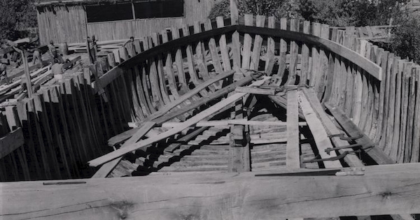 Trabajo en cubierta de nave en astillero del Maule, 1950