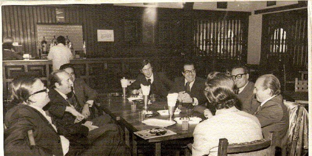 Gonzalo Vial Correa (a la derecha) junto a amigos, entre ellos, Hermógenes Pérez de Arce (de espalda) y Claudio Sánchez