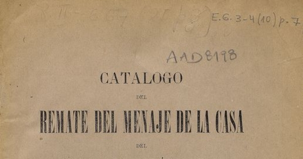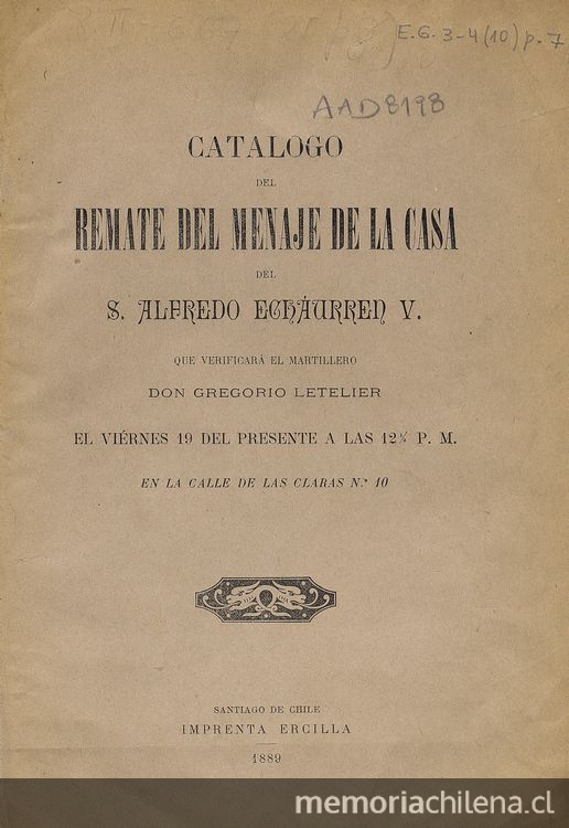 Catálogo del remate del menaje de la casa del señor Alfredo Echaurrén V. que verificará el martillero Don Gregorio Letelier...
