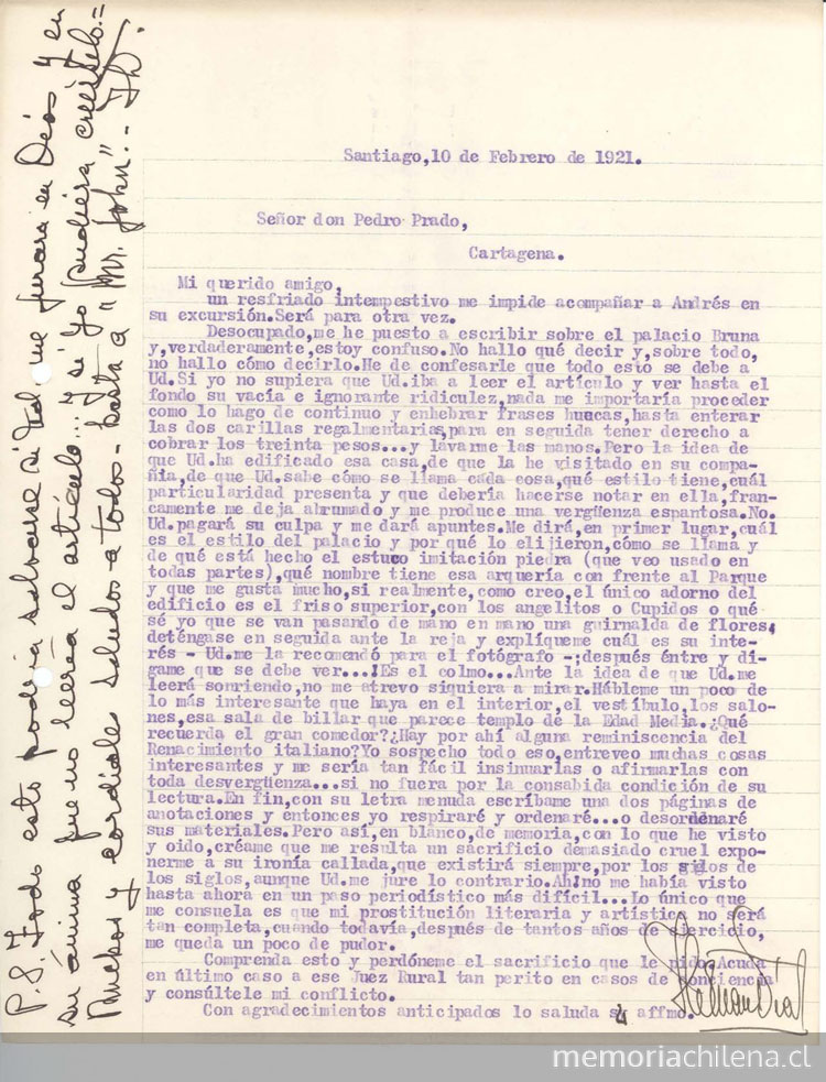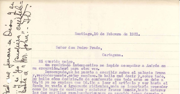 Carta de Alone a Pedro Prado, 10 de febrero de 1921, Santiago, Chile