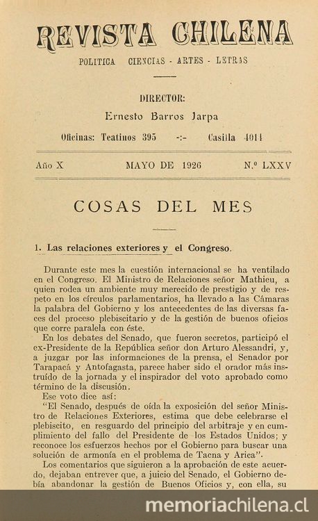 Revista chilena. Santiago : [Editor no identificado], 1917-1930 (Santiago : Universitaria) 14 volúmenes, año 10, número 75, (mayo 1926), páginas iv-viii, 2-95