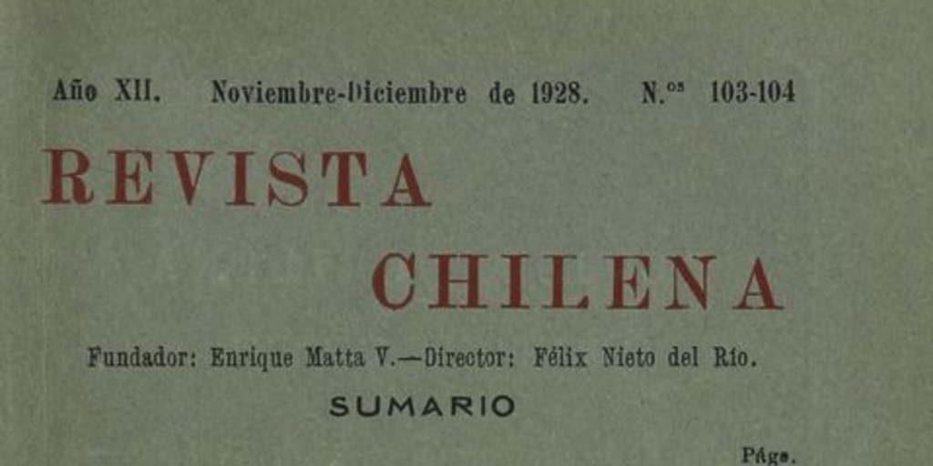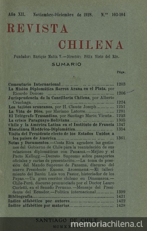 Revista chilena. Santiago : [Editor no identificado], 1917-1930 (Santiago : Universitaria) 14 volúmenes, año 12, números 103-104, (noviembre-diciembre 1928), páginas 1204-1436