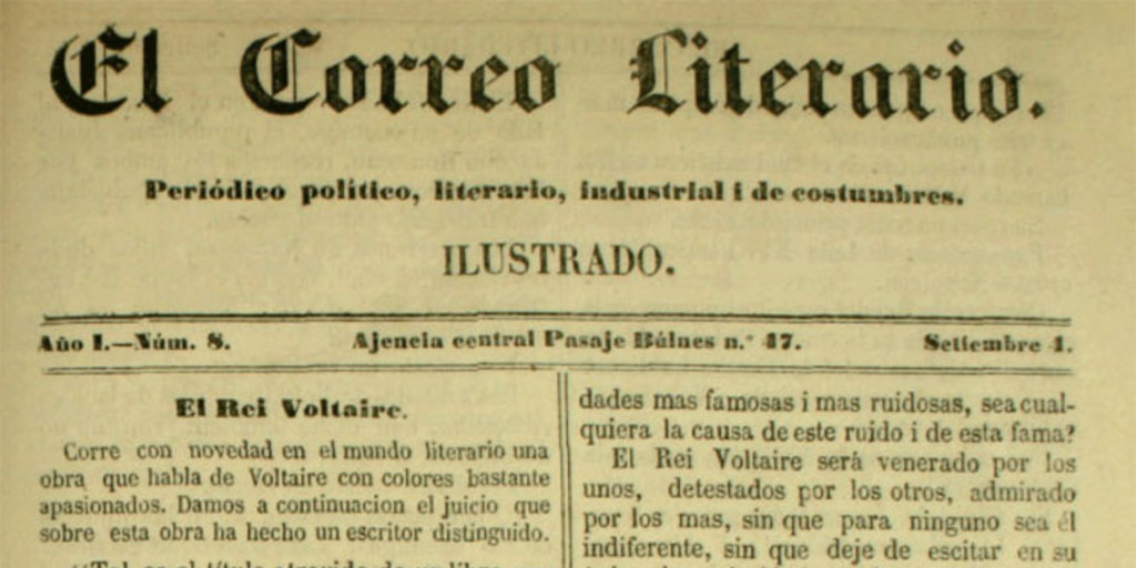 El Correo literario. Santiago : Imprenta del Conservador, 1858-1865. 2 v., [ca.138] hojas de láminas (algunas plegadas), número 8, (4 septiembre 1858), páginas 93-96