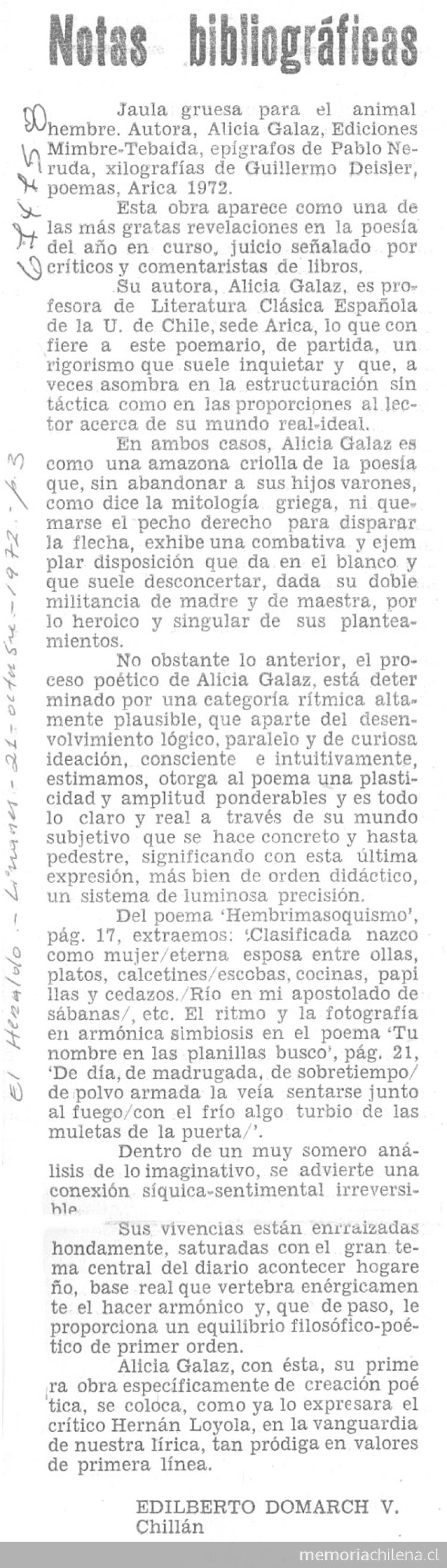 Materias: Galaz Vivar, Alicia. Jaula Gruesa para el Animal HembraAutores Chilenos
