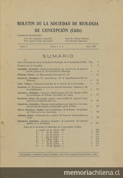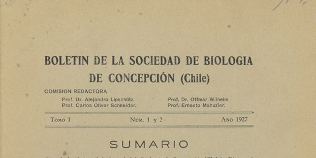Boletín de la Sociedad de Biología de Concepción. Concepción : La Sociedad, 1927-(Concepción : Hispano-Chilena) volúmenes, tomo I, número 1-2, (1927), páginas 1-11