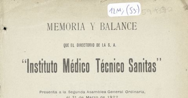 Memoria y balance que el Directorio de la S.A. Instituto Médico Técnico Sánitas presenta a la Segunda Asamblea General Ordinaria, el 31 de marzo de 1922