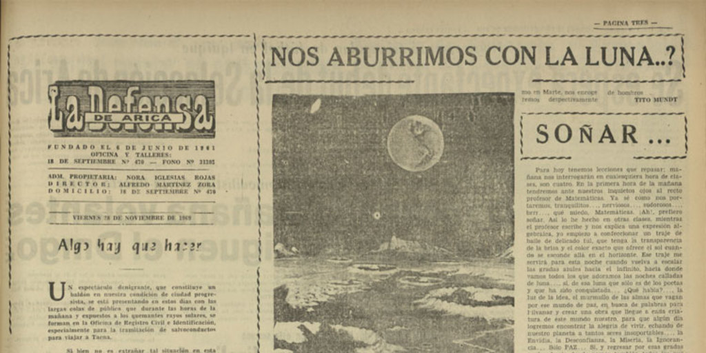 La Defensa. Arica : [Editor no identificado], 1950?-1957. 6 volúmenes (28 noviembre 1969), página 3