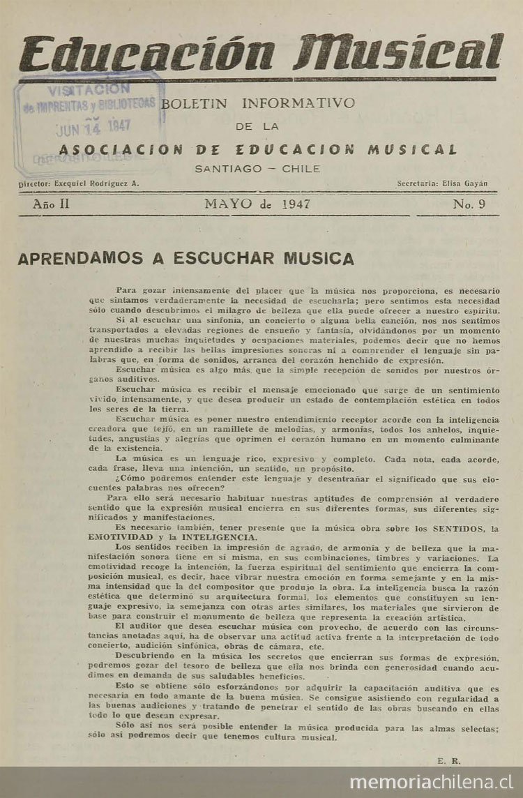 Educación musical : boletín informativo de la Asociación de Educación Musical. Santiago : La Asociación, 1946-1950. 5 volúmenes, año II, número 9, (mayo 1947)