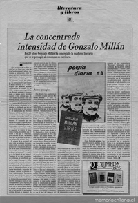 Regresó a Chile en 1984, donde publicó Seudónimos de la muerte (1984), álbum de la vida burguesa, que cuestiona la relación amorosa y pone de manifiesto la crisis de un ámbito doméstico orientado al consumo. A partir de 1985 fue director de la revista El espíritu del valle (1985-1998). Durante los últimos años de la dictadura publicó Virus (1987), en el que reflexiona sobre la función de la poesía y del arte ante el poder. Ese mismo año se instauró el Premio Pablo Neruda de poesía, que Millán obtuvo por unanimidad. Desde esa fecha y hasta 1997 se instaló en Holanda, víctima de lo que llamó una "mudez poética". En esos años se dedicó a una actividad fuertemente ligada a su quehacer poético: la creación de artefactos, esculturas, objetos y libros de artista; en definitiva, una serie de trabajos que se enmarcan dentro de la poesía visual.