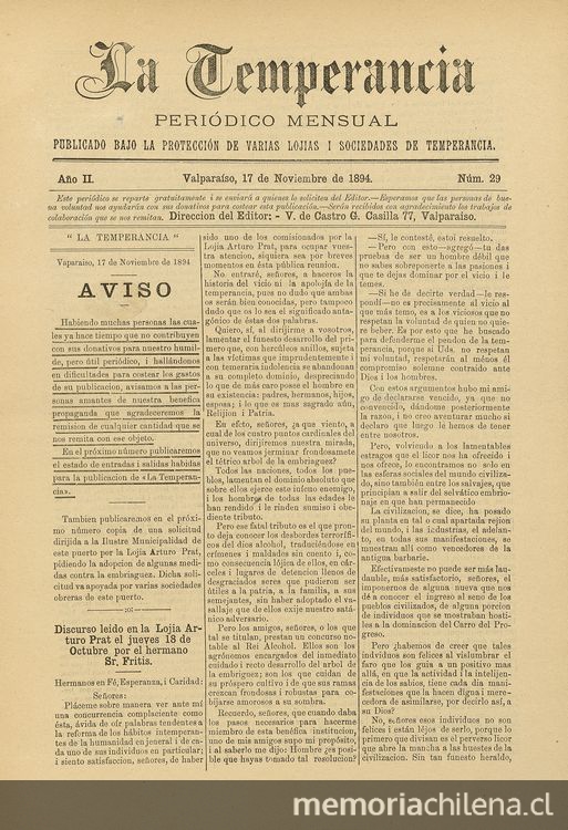 La Temperancia. Valparaíso : Imprenta La Temperancia, 1892-1895.1 volumen, año 2, número 29, (17 noviembre 1894)