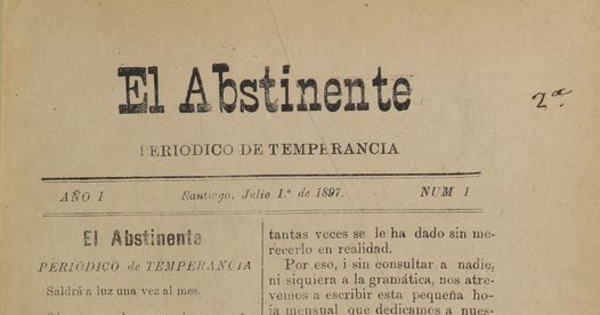 El Abstinente. Santiago : El Consejo, 1897-1903 (Santiago : Imprenta Popular) 6 volúmenes, año I, número 1, (1 julio 1897)