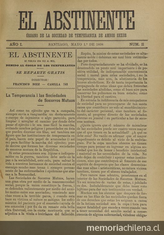 El Abstinente. Santiago : El Consejo, 1897-1903 (Santiago : Imprenta Popular) 6 volúmenes, año I, número 11, (1 mayo 1898)