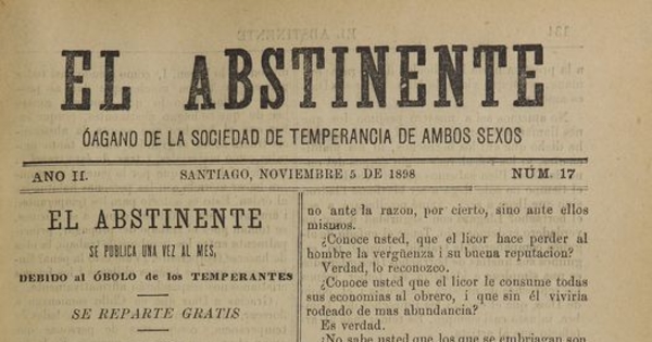 El Abstinente. Santiago : El Consejo, 1897-1903 (Santiago : Imprenta Popular) 6 volúmenes, año II, número 17, (1 noviembre 1898)