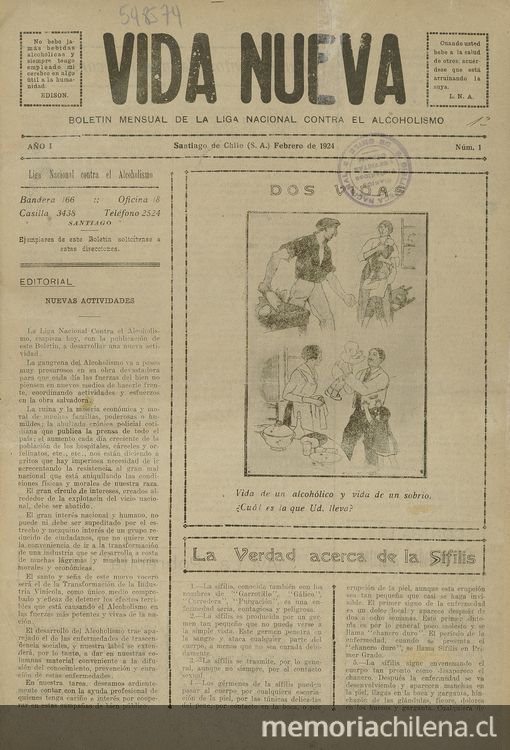 Vida nueva / boletín mensual de la Liga Nacional Contra el Alcoholismo. Santiago : La Liga, 1924-1936. 86 números, año I, número 1, (febrero 1924)
