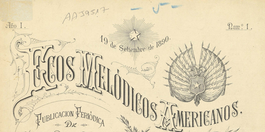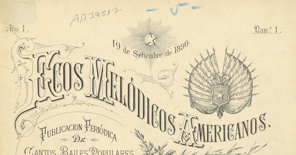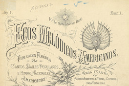 Título secundario: Ecos melódicos americanos: publicación periódica de cantos, bailes populares e himnos americanos ; para canto con acompañamiento de piano y guitarra, para piano solo, o para guitarra sola: año 1, número 1