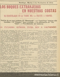 Noviembre. Se libra en aguas chilenas la Batalla de Coronel entre buques alemanes e ingleses, saliendo victoriosa la escuadra alemana.