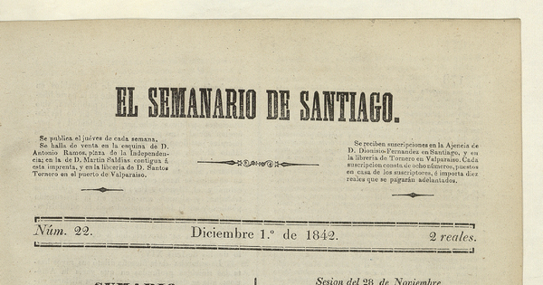 El Semanario de Santiago. Santiago : Imprenta de la Opinión, 1842-1843. 31 números, número 22, (1 diciembre 1842), páginas 178-179