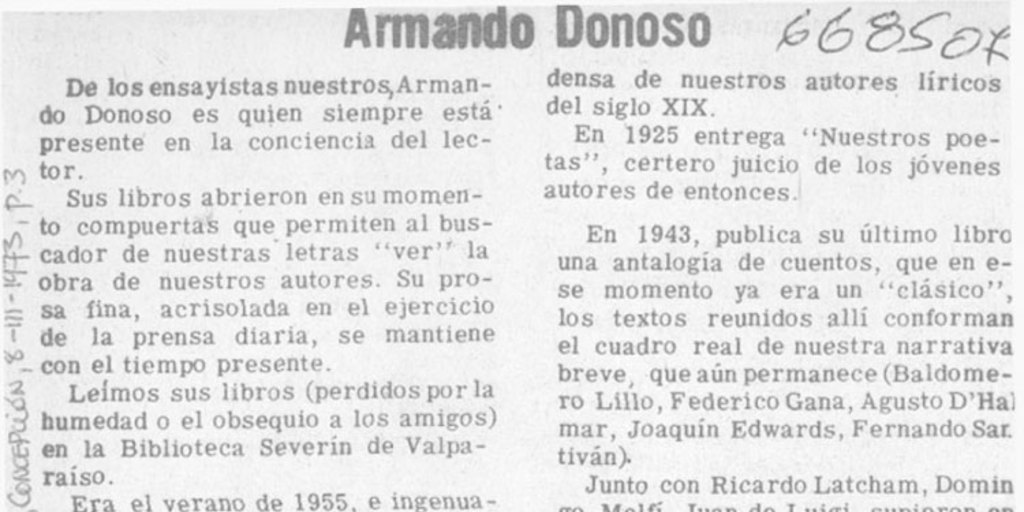 Materias: Donoso, Armando, 1886-1946Autores Chilenos - Siglo 20