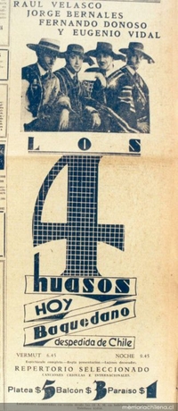 12 de julio. Debut de Los Cuatro Huasos con el nombre de Cuarteto Criollo Chileno, en el Teatro Victoria, de Santiago