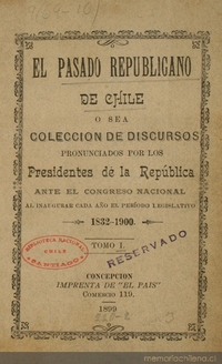 Discurso de S.E. el Presidente de la República en la apertura del Congreso Nacional : 1892-1896. Santiago de Chile :Impr. Nacional,1892. v. ;25 cm.
